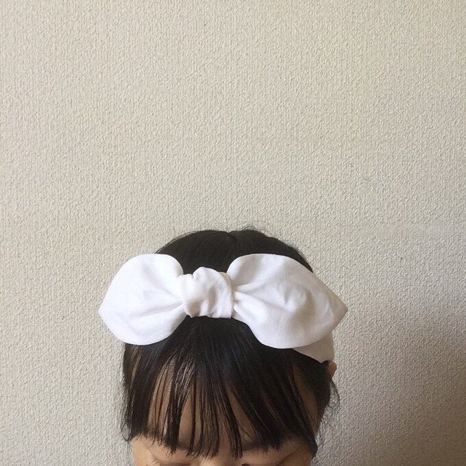 ホワイトのコットン生地を使用してお作りしたカチューシャは、可愛らしいうさ耳リボンが特徴です。
