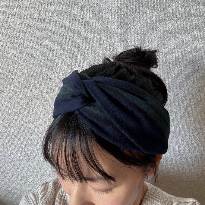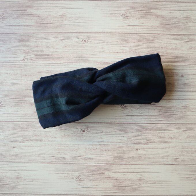 緑、黒、ネイビーのタータンチェックが魅力的なこのヘアバンドは、起毛したコットン生地で作られており、ふんわりとしたボリューム感と温かみを兼ね備えています。