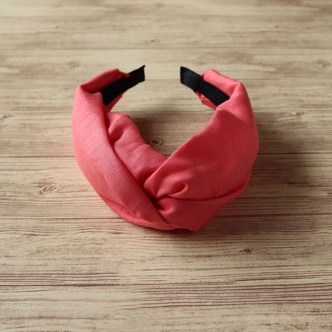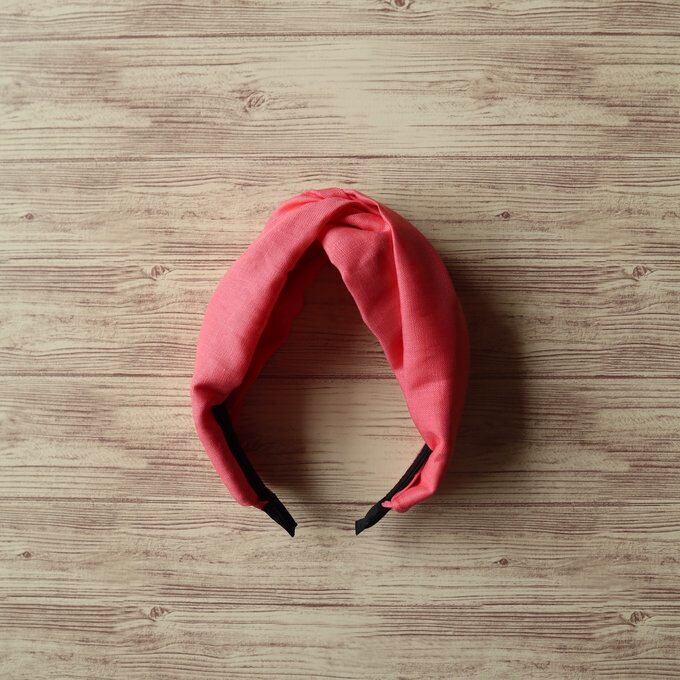 このクロスターバン風カチューシャは、リネンのコーラルピンクで仕立てられ、可愛らしさと優雅さを兼ね備えています。