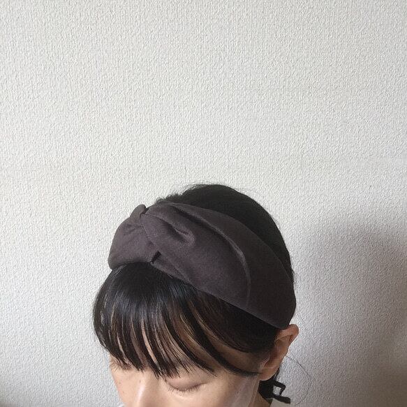 落ち着いたダークブラウンのリネン生地で仕立てたクロスターバン風カチューシャ。