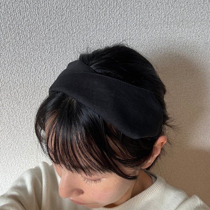 上品なリネンの黒生地を使った、シンプルでありながら洗練されたツイストデザインのカチューシャです。